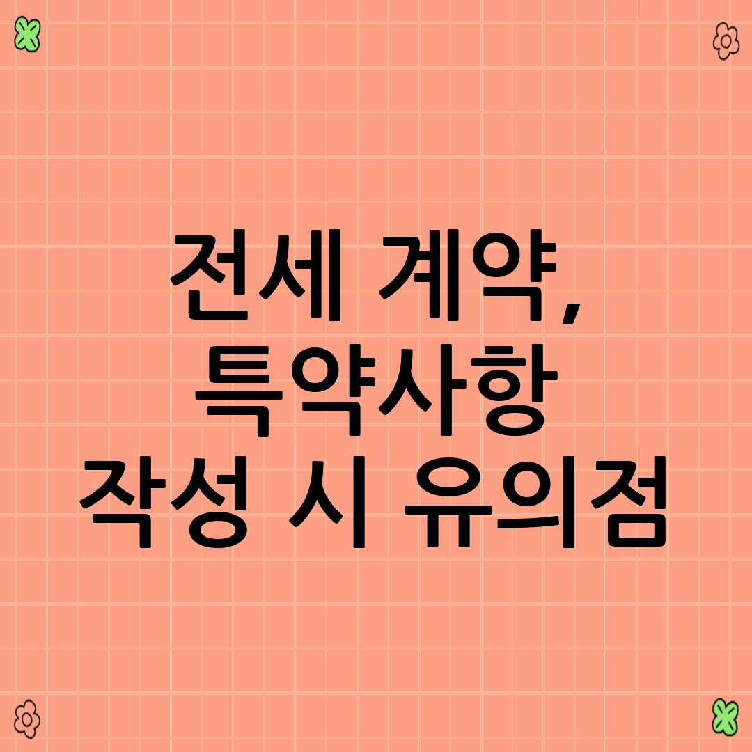 특약사항은 전세 계약의 중요한 부분이며, 꼼꼼하게 준비하고 작성하는 것이 중요합니다. 이 글이 여러분의 안전한 전세 계약에 도움이 되기를 바랍니다.